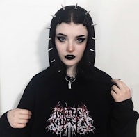 Hoodie with metal spikes on hood , studded hoodie , studded jacket , spiked jacket , spiked goth hoodie , in the morgue , spiked hoodie , hoodie with spikes on the hood , goth hoodie , morgue horde , Morguehorde , morguexhorde , goth jacket , spike jacket , spike hoodie , goth popsocket , goth t shirt , goth shirt , goth emo , in the morgue hoodie , in the morgue shirt , in the morgue clothing